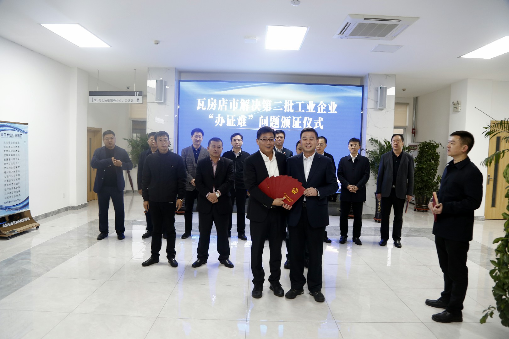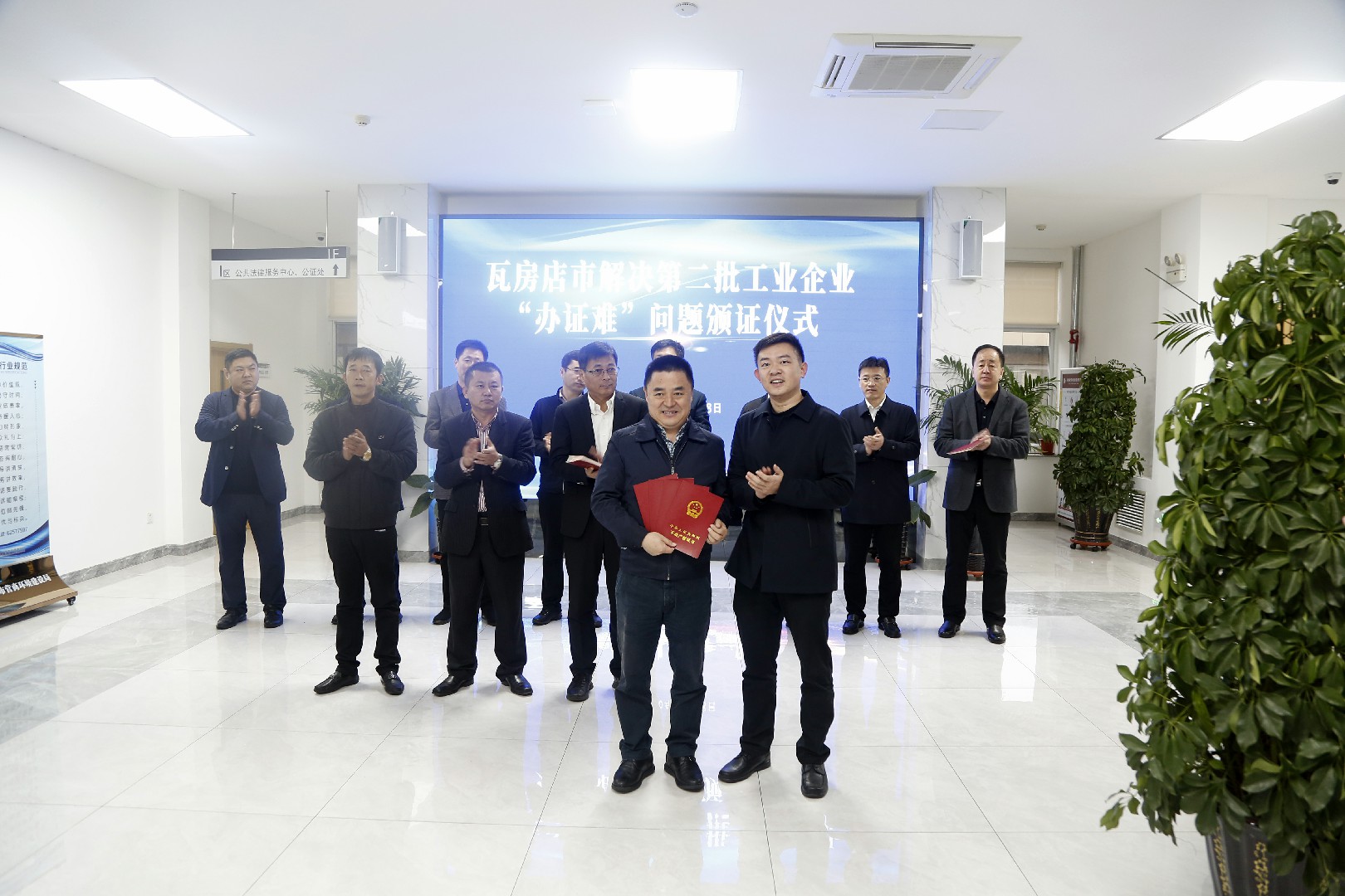 11月18号上午,我市在政务服务中心举行第二批工业企业“办证难”集中颁证仪式。市长周振雷,市委常委、副市长林晓晖,市政府办、科工局、自然资源局、住建局、营商局、轴承产业开发区、九龙街道、祝华街道等部门相关领导参加活动。