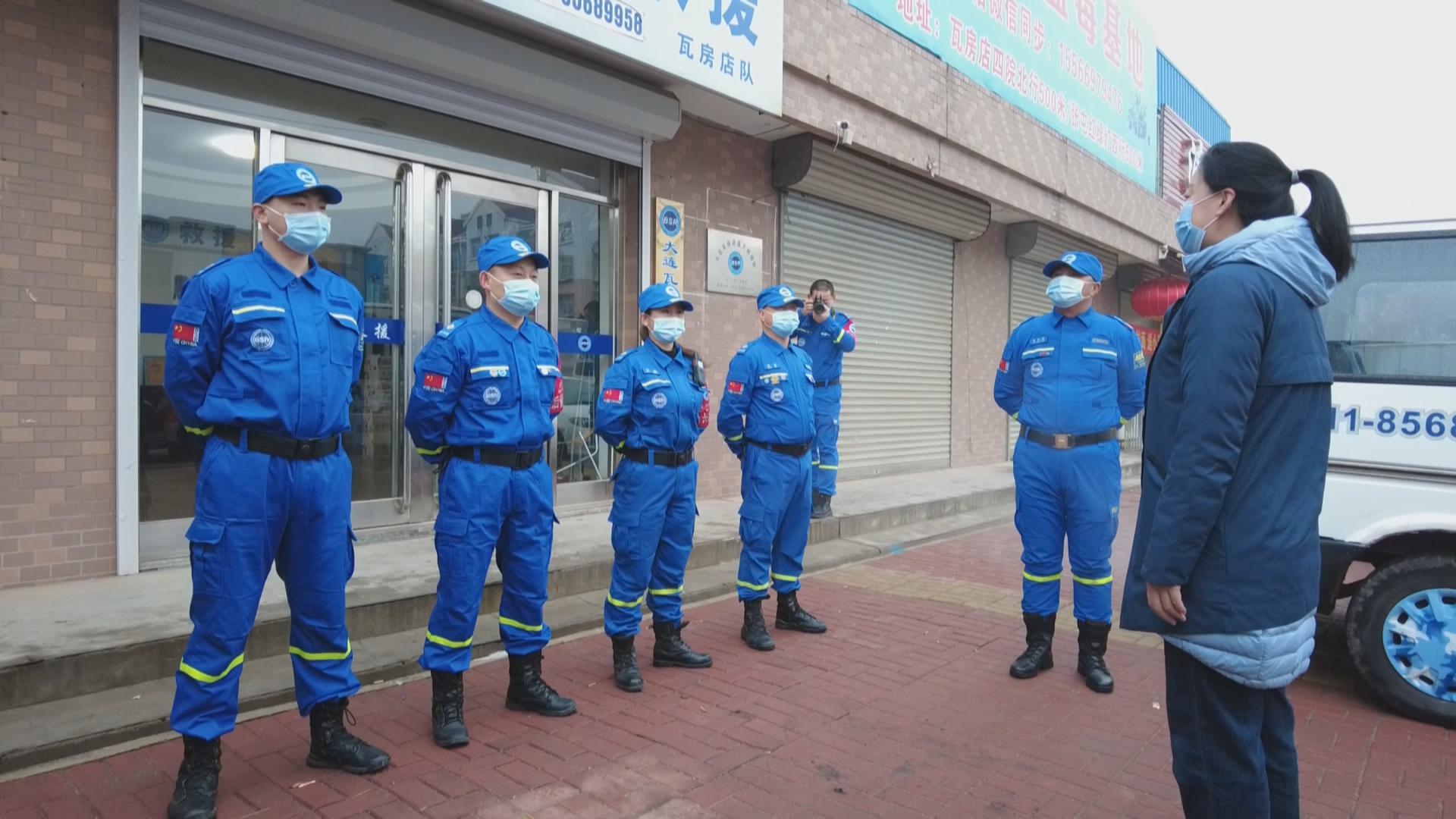 当天一大早,举行欢送仪式,瓦房店市平安志愿者协会向蓝天救援队授旗,大家共同为驰援队员送行。