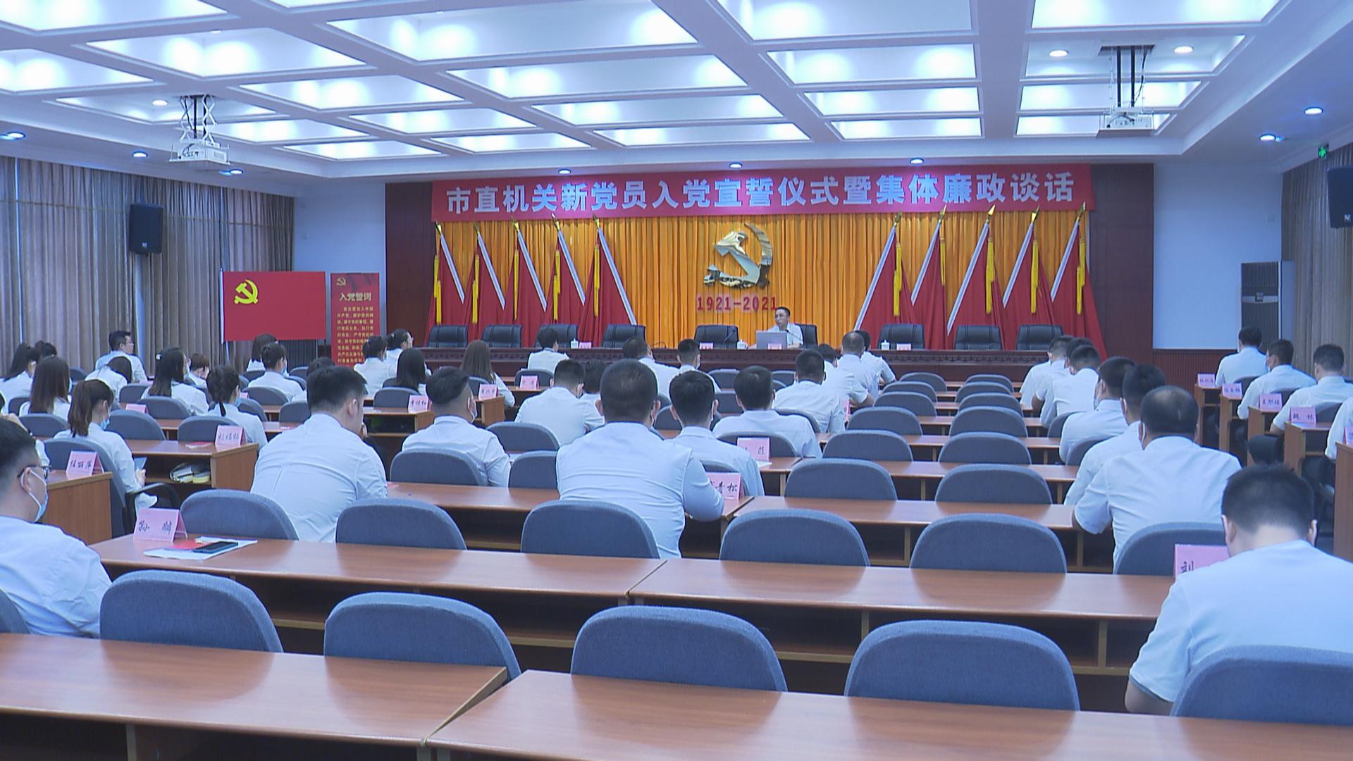 在“七一”党的生日即将到来之际,市直机关工委组织开展新党员入党宣誓仪式暨集体廉政谈话,来自全市直属机关事业单位的63名新党员,面对党旗庄严地举起右手,许下郑重的承诺。