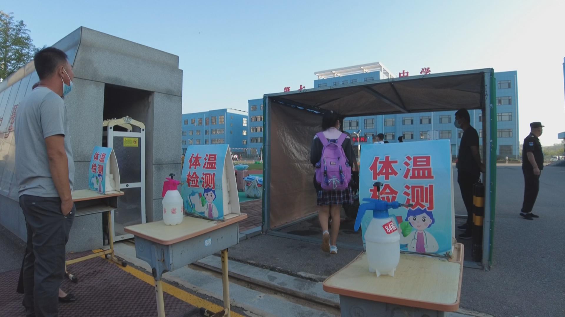 开学第一天,一大早,在市第七初级中学门口,同学们保持安全距离,主动测量体温,正在有序进入学校。