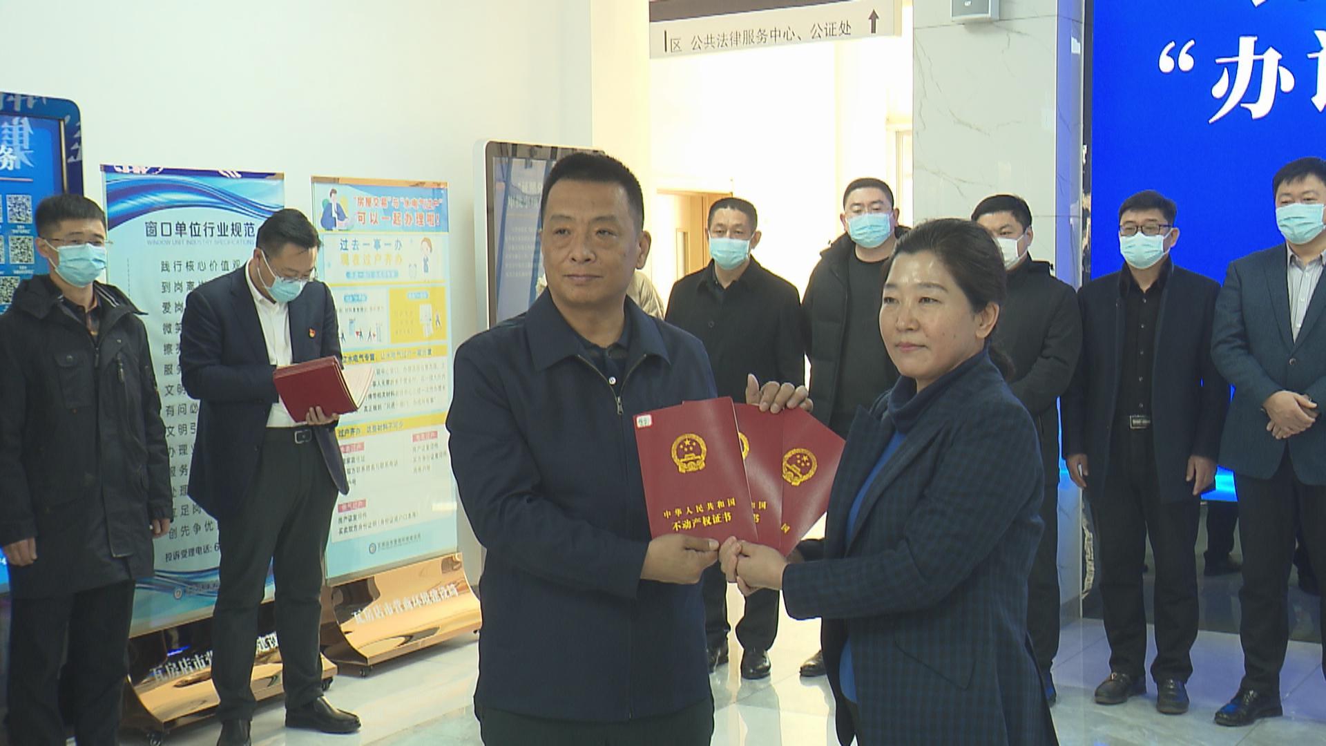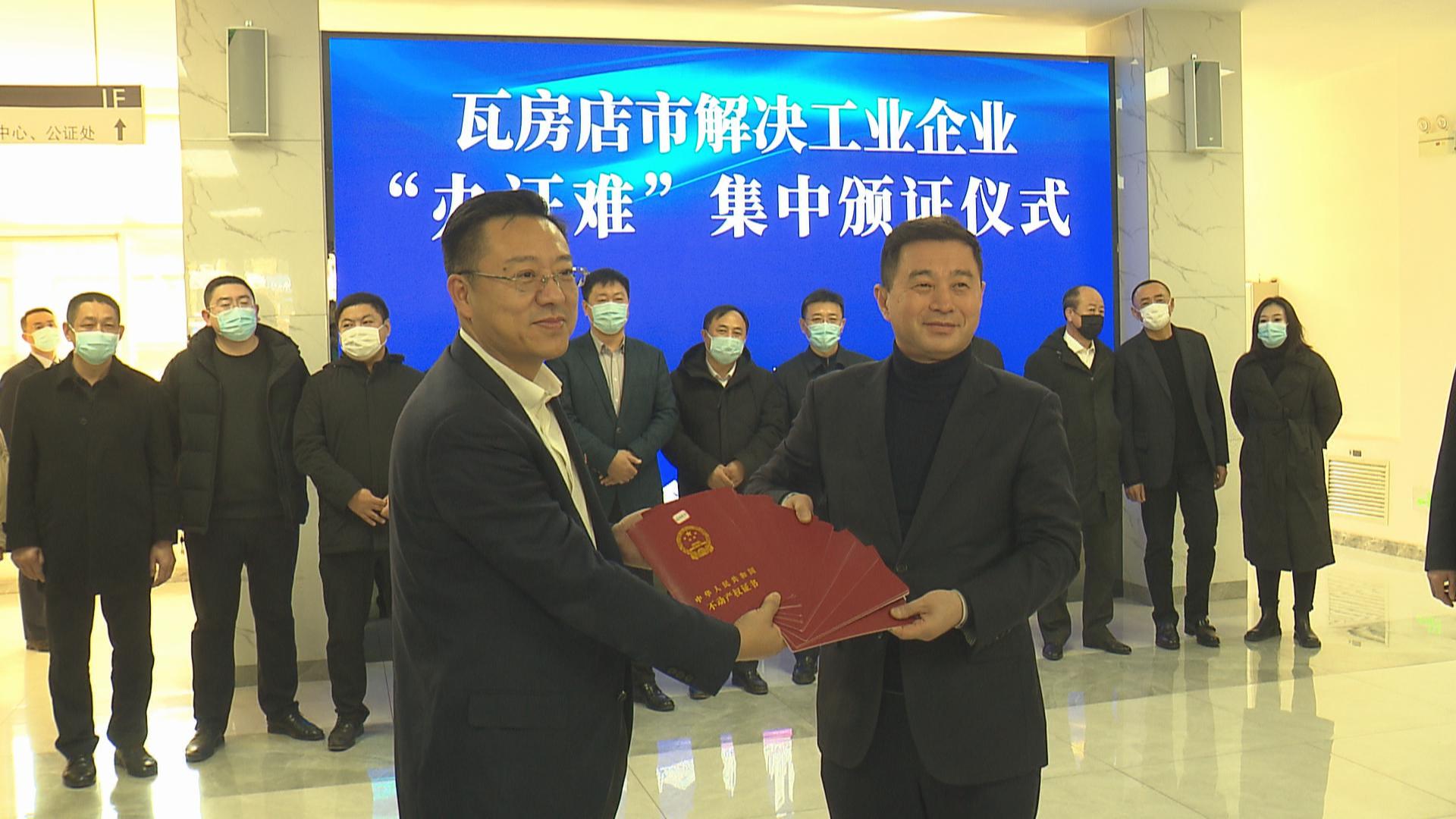 仪式上,市领导现场为国网瓦房店市供电公司、中电投东北新能源(大连)驼山风电有限公司、大连鼎盛供热有限公司、大连鼎隆供热有限公司、大连瓦通轴承制造有限公司等11家企业发放47本房产证和1本消防证。