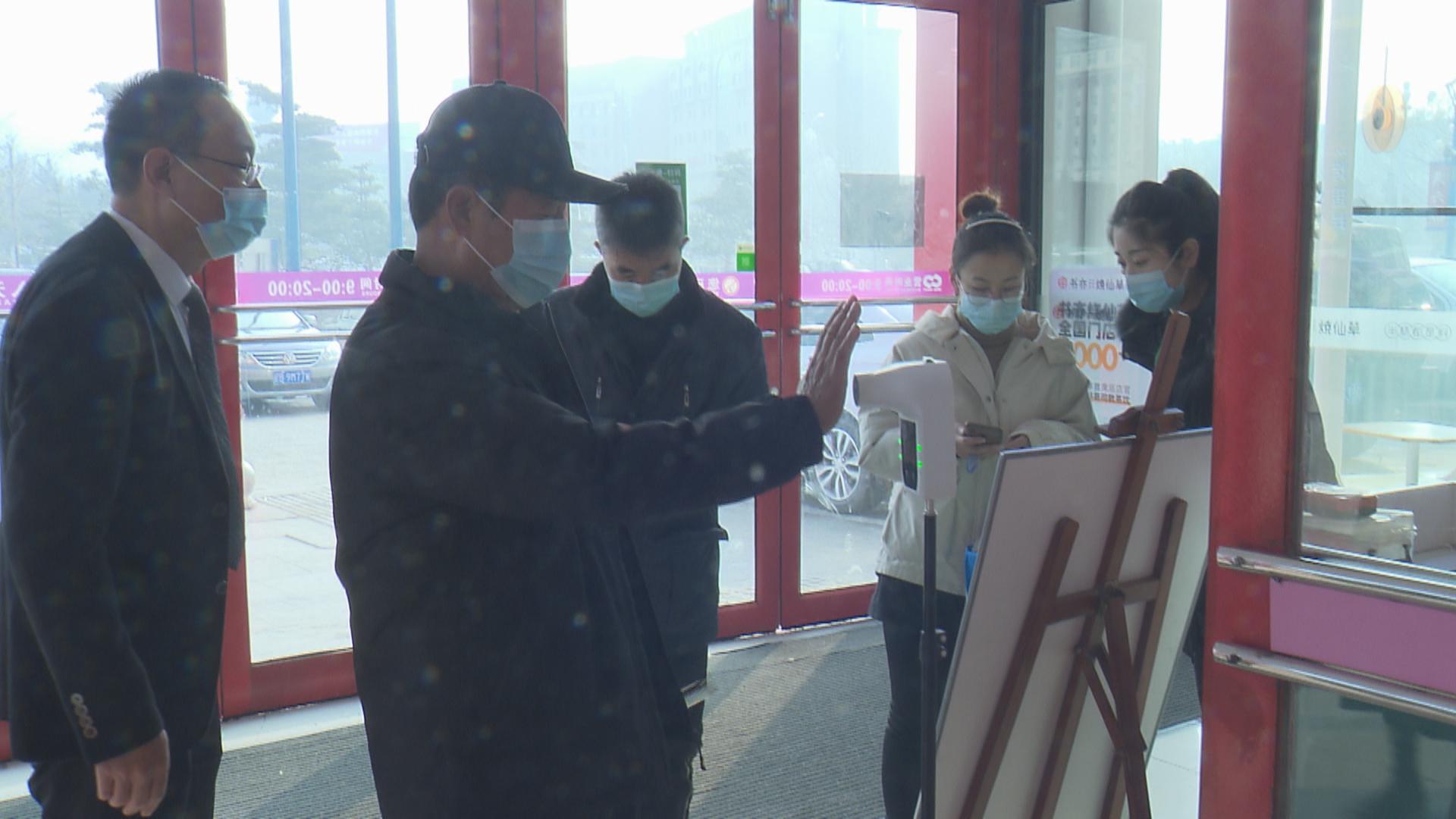 在大商新玛特正门内,记者看到,几名工作人员正在引导顾客有序进入,并提醒大家佩戴好口罩、保持间距、测量体温、扫码入场。
