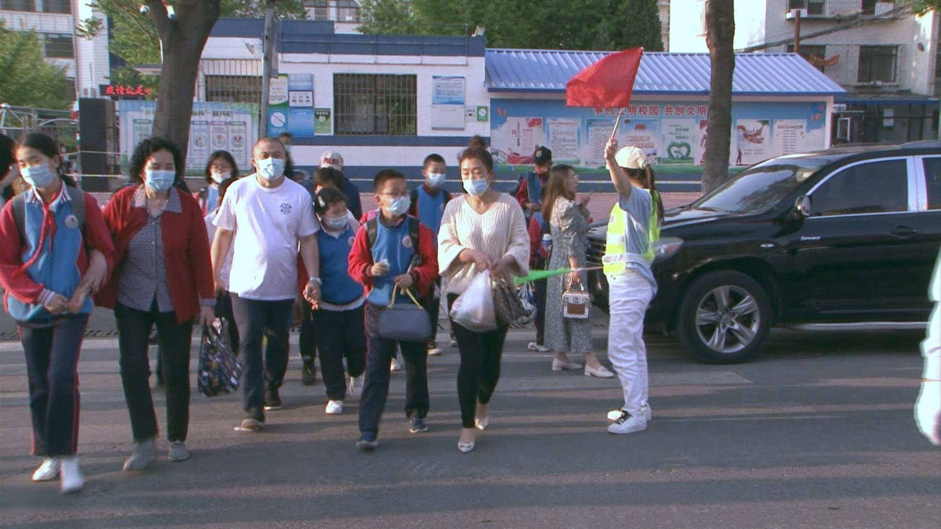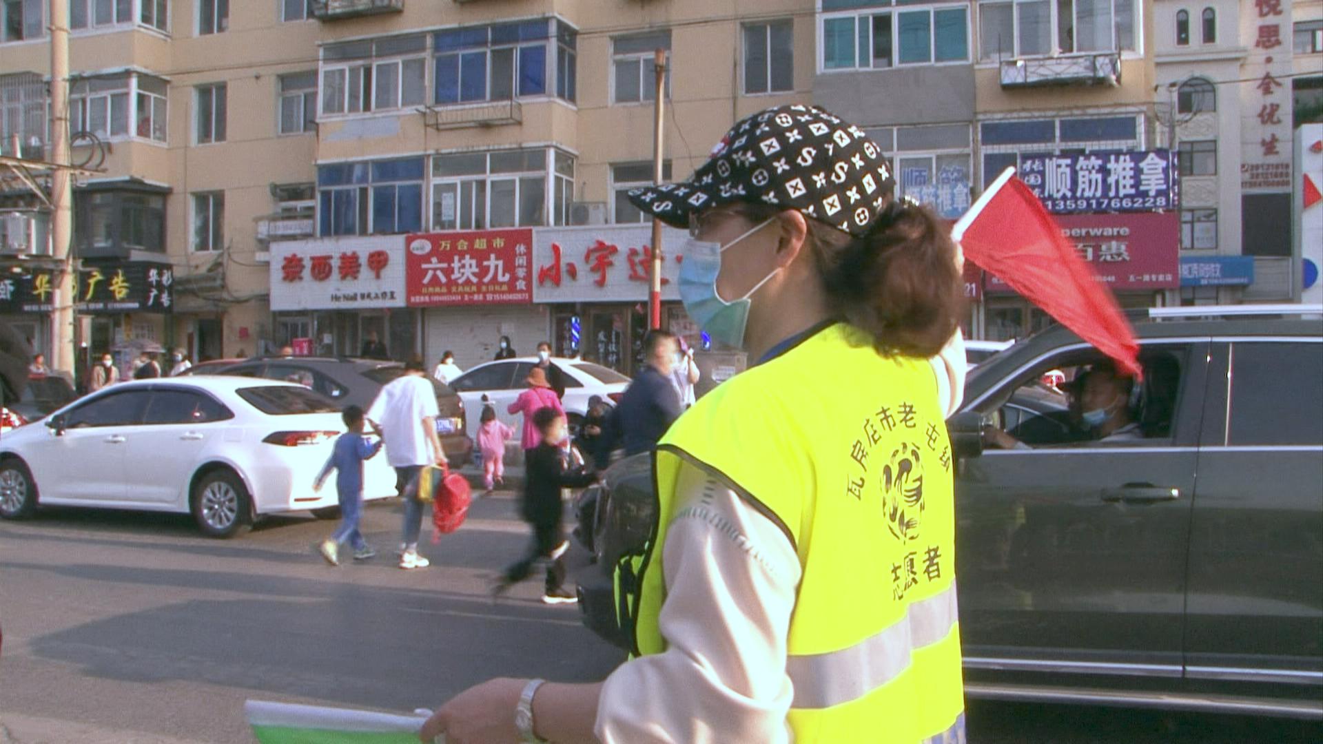5月19号傍晚五点左右,记者在义勇小学门口看到,市慈善总会老虎屯义工队的八名队员穿上绿马夹已在人行道口站好,当学生从校门口走出来时,他们便立即行动起来,协助交警指挥车辆,方便学生和家长穿过人行道。而这项义务服务在市慈善总会的组织下已经坚持了十一年了,“绿马夹”义工成了学生放学路上一道风景线。