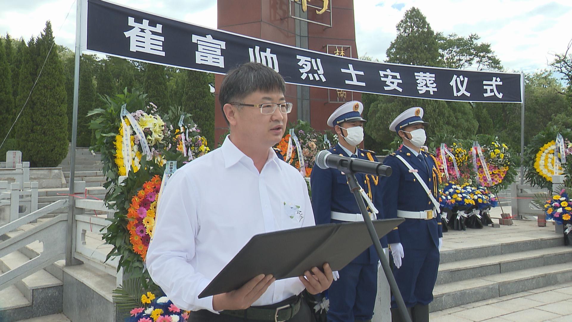 市委常委、副市长王占林在仪式上致悼词,他代表市委、市人大、市政府、市政协和百万父老乡亲,向英雄烈士表示深切的哀悼,向烈士家属表示诚挚的慰问,向烈士的英雄壮举致以崇高的敬意!王占林说,今天我们怀着无比崇敬的心情,在这里沉痛悼念英雄的瓦房店之子崔富帅烈士。我们不会忘记在党和人民最需要的时候,面对生与死的考验,崔富帅同志主动请缨,不畏艰险,冲锋在前,在营救了6名被困群众后,毅然决然地再次冲进火海,用年轻而宝贵的生命诠释了“对党忠诚、纪律严明、赴汤蹈火、竭诚为民”的铮铮誓言,谱写了一曲感天动地的英雄壮歌。今天英雄入土为安,对英雄最好的纪念,就是要将英雄用生命捍卫的事业进行到底,就是要把曾经哺育过英雄成长的家乡建设好。王占林指出,全市上下要大力宣传崔富帅同志的先进事迹,大力营造学习英雄、崇尚英雄、争当英雄的浓厚氛围。要化悲痛为力量,学习他坚定信念,听党指挥的精神追求;学习他苦练内功,敢打硬仗的过硬本领;学习他忠诚为民,敢于奉献的优秀品格。把对英雄的追思转化为干事创业的强大动力,以更加奋发有为的精神状态建设我们的家园,让青山绿水更加富饶美丽,让群众生活更加幸福安康,以实际的行动告慰烈士的英灵。