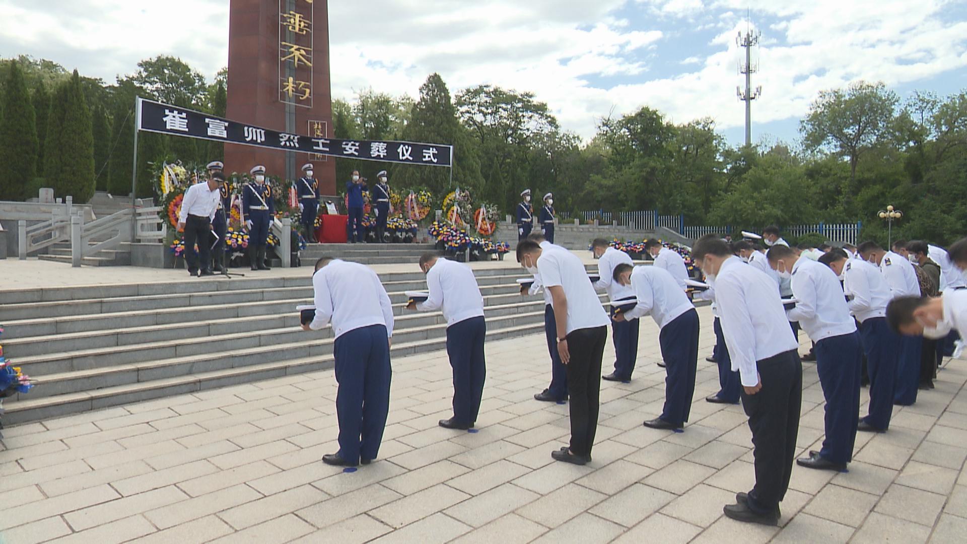 仪式最后,伴随着肃穆的哀乐,与会人员向崔富帅烈士鞠躬告别,并依次向烈士敬献鲜花,寄托哀思。