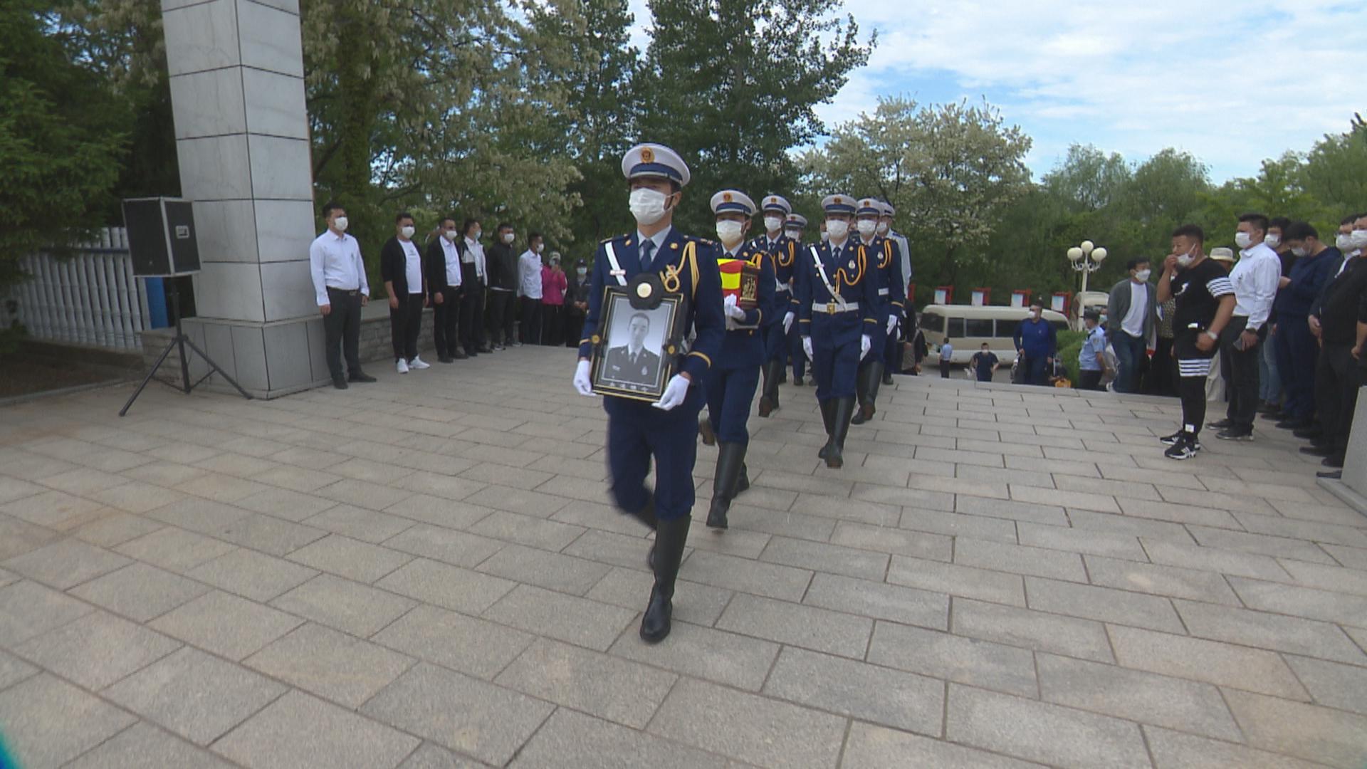 上午9时许,灵车抵达烈士陵园,六名礼兵战士护送烈士的骨灰庄严入场,全体脱帽肃立向烈士默哀。