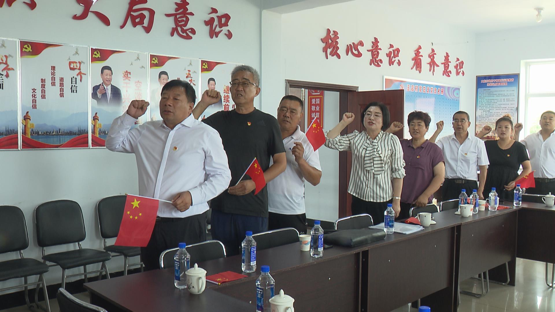 7月1号是党的生日,在太阳街道王店村的会议室内,来自大连市、我市慈善组织和太阳街道王店村党总支的党员们在庄严的党旗下,重温入党誓词。