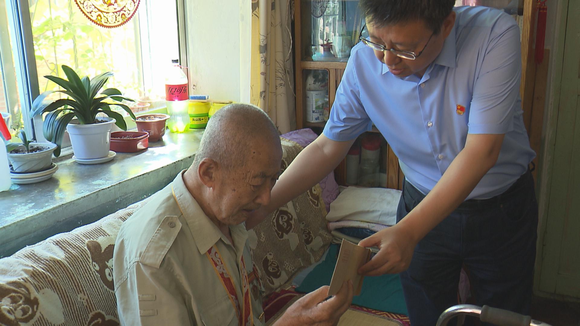 在赵文环家中,马英骥与老人促膝长谈,关切询问他的身体状况和家庭生活情况,详细了解老人生活中存在的困难,并为老人送上节日慰问金和慰问品。