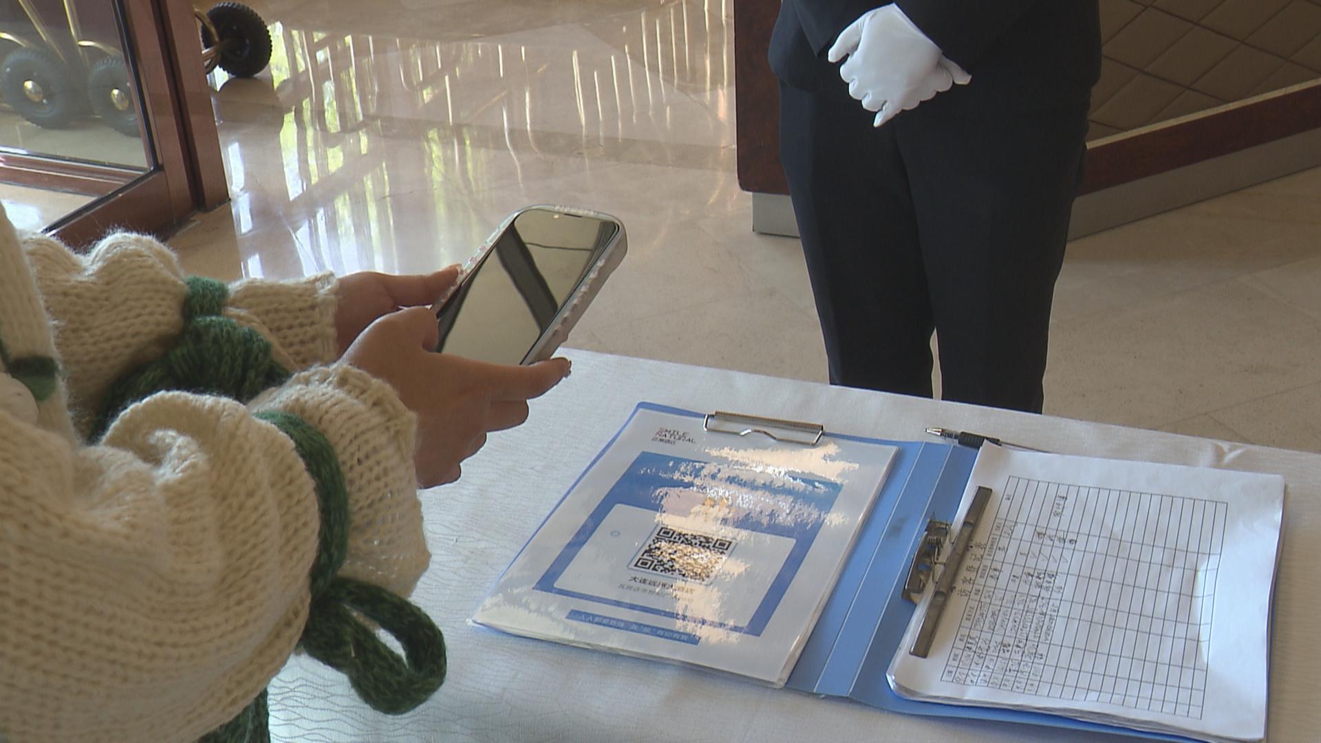 在远洲酒店,记者发现,入口处张贴了“场所码”,并安排专人值守,提醒进入的顾客扫“场所码”,对于一些没有使用智能手机,不能扫码的老年人,值班人员进行了体温测量并手动登记。