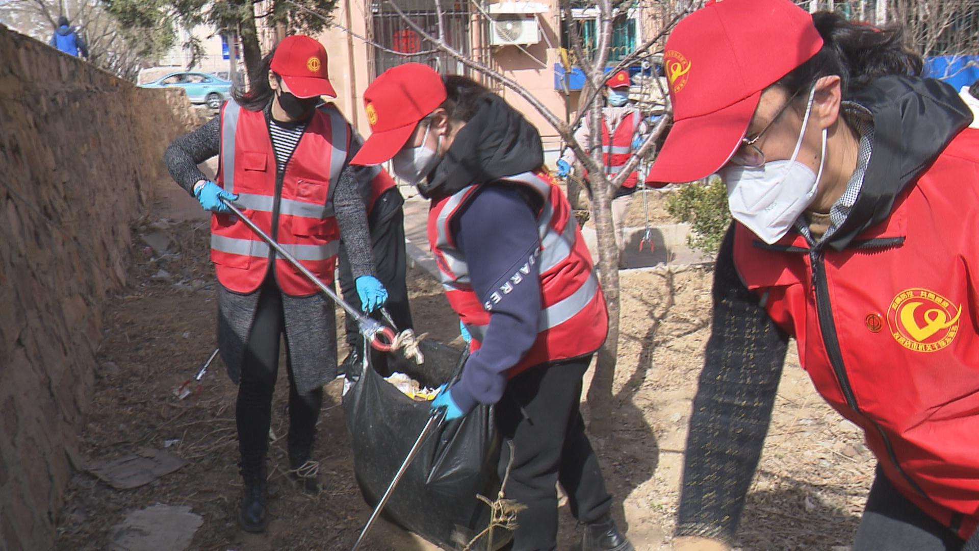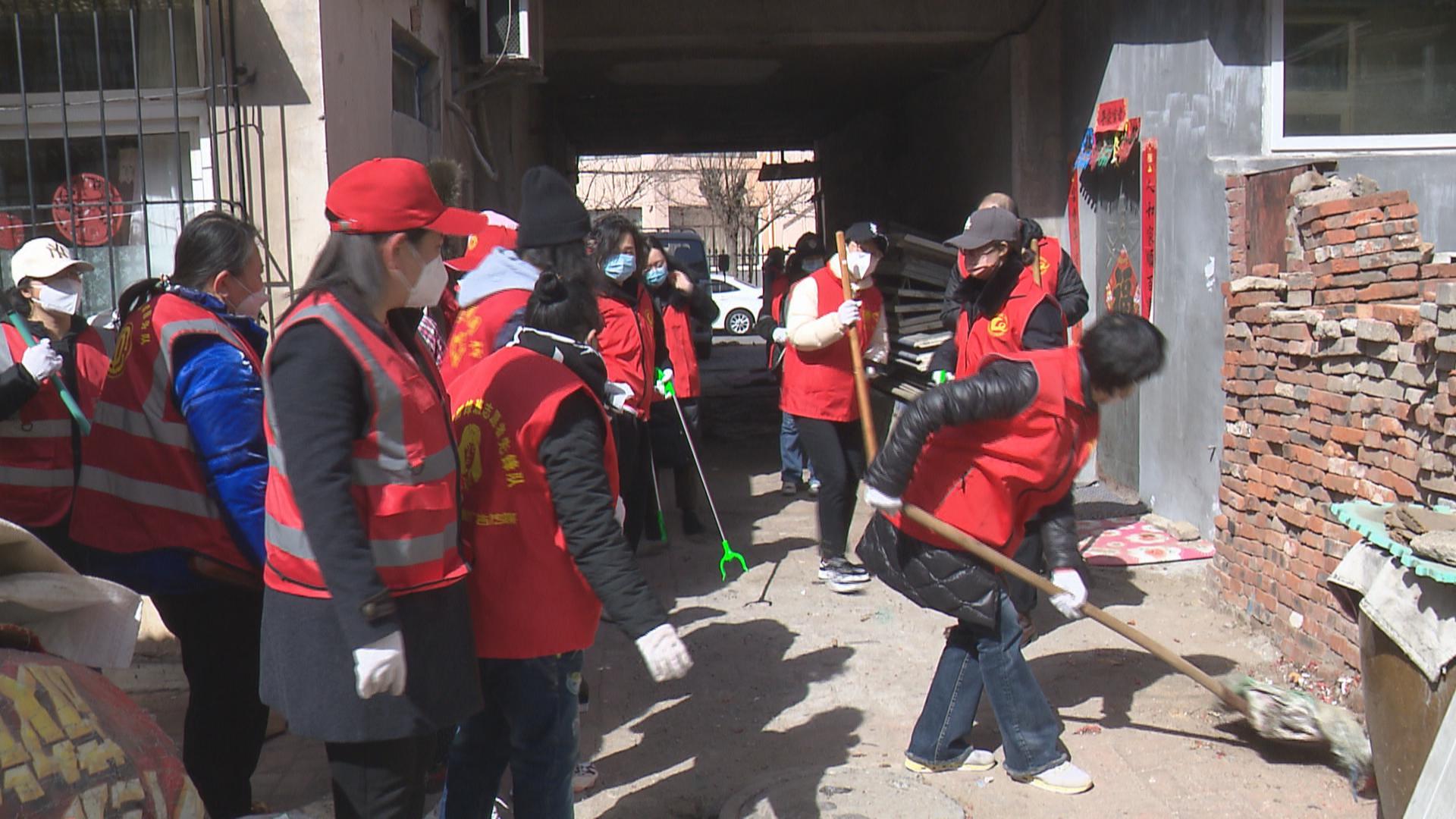 在东风社区,社区工作人员与机关干部一起,清扫街道内的生活垃圾以及建筑垃圾,将角落堆放的杂物铲除放进袋子清理掉,使道路变得宽敞整洁。