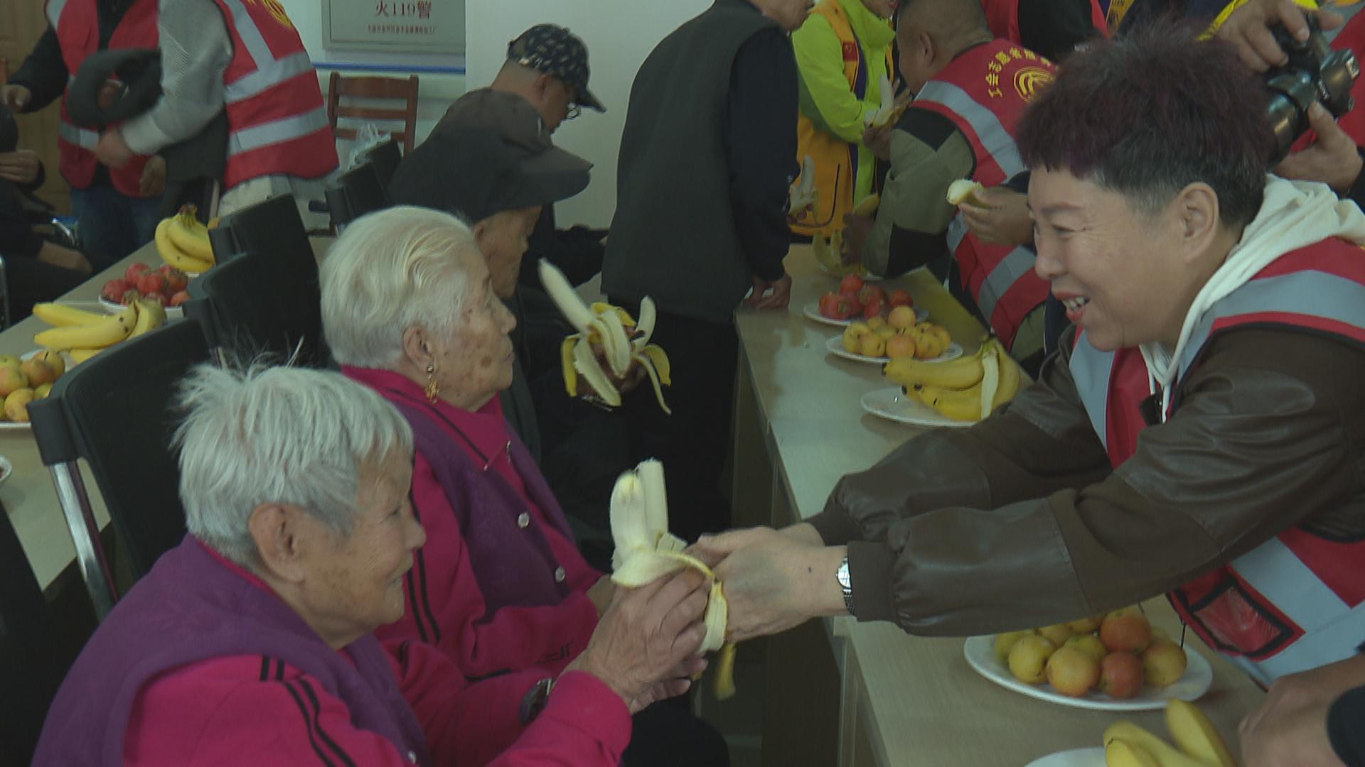 活动中,志愿者们将饼干、蛋糕、香蕉等点心和水果摆放到老人面前,为每名老人发放爱心保暖马甲。并深入到一些行动不便老人们的房间,为他们送上食品、水果等物品。