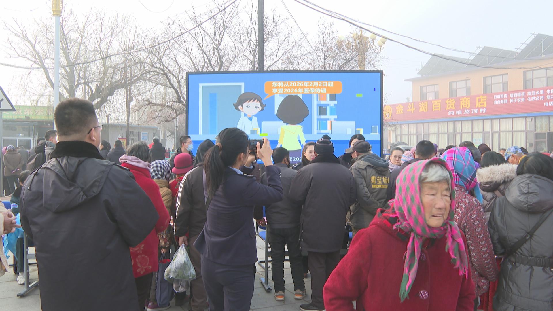 为进一步做好2026年度城乡居民基本医疗保险参保缴费工作,提高广大群众对社保医保政策的知晓率和参保积极性,日前,大连市及我市税务局、社保中心、医保中心、交通银行等相关单位工作人员走进我市太阳街道王店村开展社保医保“大篷车”公益宣传活动。